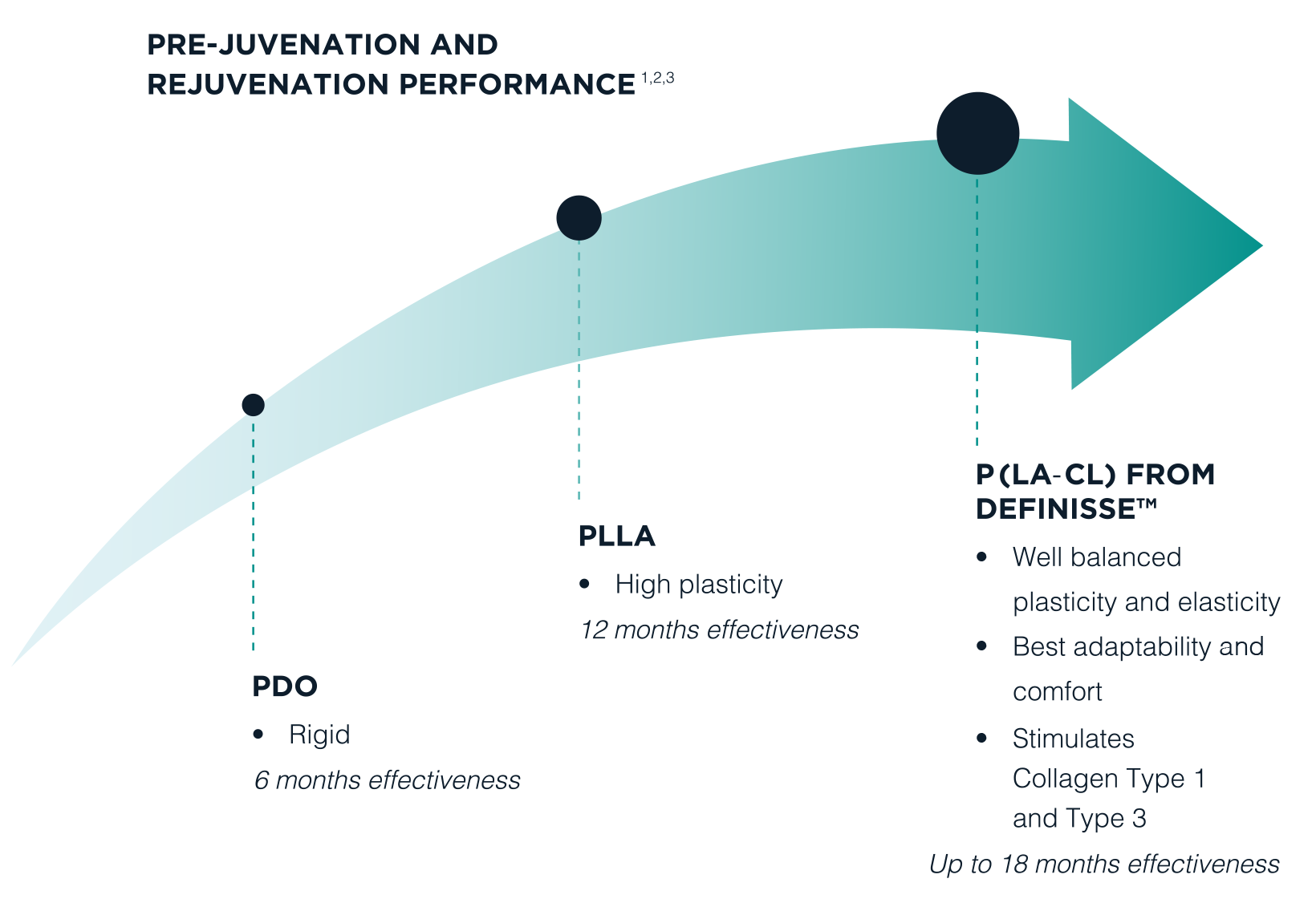 Not only does P(LA-CL) carry all the benefits of longevity and adaptability - and enjoy best in class proof of performance through its use in DefinisseTM 3D lift threads - but it is the only thread material to regenerate Collagen Type 1 and Type 3 - PDO and PLLA threads only stimulate Type 1.